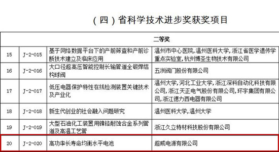 超威集团一科研项目获浙江省科学技术进步二等奖